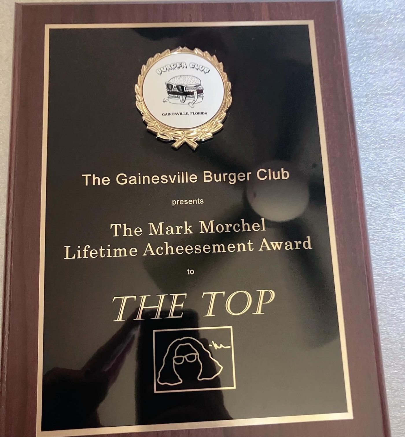 For those that didn’t know him, Mark Morchel was a person of integrity and honor. He lived his life looking out for and loving his family and friends. And, maybe most importantly, he was a true connoisseur, forever seeking the ultimate cheeseburger. Sadly, we lost Mark last year. But we wanted to keep his memory alive for eternity by instituting Gainesville Burger Club’s highest honor: The Mark Morchel Lifetime Acheesement Award.