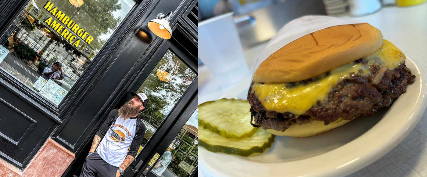 Finally, we arrived at Hamburger America. We stepped inside and were greeted with patrons sitting at the grill top watching burgers being smashed and griddled.